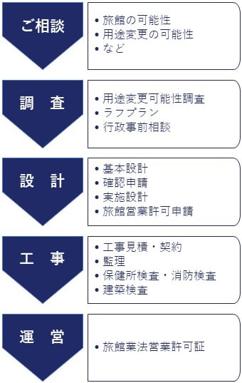 ラフプランを基に保健所や建築課や消防署と事前相談をして、旅館営業の可能性を確認します。