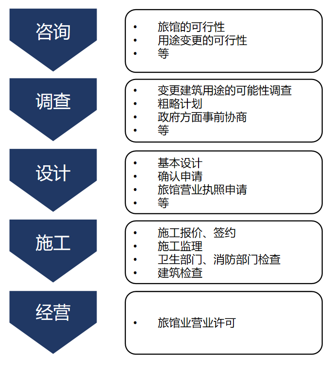 为了获得旅馆、酒店、简易宿舍等的经营许可,必须清楚与建筑、消防、保健卫生相关的法律以及根据当地政府而有所不同的条例。必须在满足若干法律条例的同时,提高业务可行性的计划。