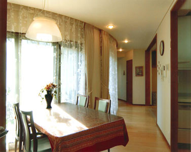 しかも、南側に2台駐車可能なパティオを設けてである。このパティオ、円形上に建物をくりぬいている。そのため壁の周長は長く、多方向からの光が、時間の経過とともにいろいろと表情を現す。そして、ここが2世帯間のコミュニケーションを、何気なく容易にさせる装置となっている。お互いの気配や音、相手を思う意識がそうさせているのかも知れない。
