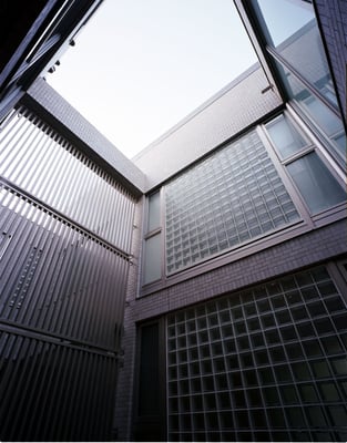 周辺への配慮ため窓は細め、ガラスは不透明。息苦しさをコートハウスとバルコニーテラスが解消してくれる。そこに面する開口は可能な限り大きく設けられた。その中央に渡り廊下が掛けられ、住戸内にパブリック的なエリアとプライベイトなエリアが生まれた。(㈱村井敬合同設計にて担当)